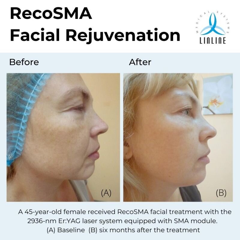 La paciente K., de 45 años, recibió un tratamiento RecoSMA de acción profunda con láser Er:YAG + módulo SMA (Plataforma Láser Multilínea). Tras el tratamiento, la paciente K. mostró mejoras panfaciales en el tono y la textura; la profundidad de las arrugas y los pliegues nasolabiales disminuyó claramente; se produjo un estiramiento de la piel seis meses después del tratamiento.